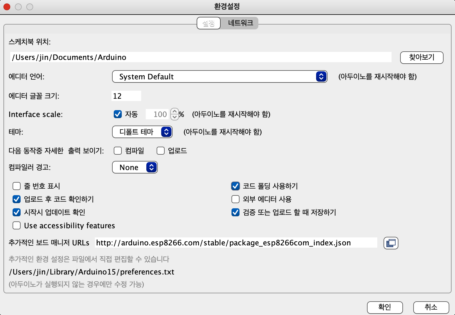 환경설정에 들어가 추가적인 보드 매니저 URLs에 아래 주소를 입력하여
