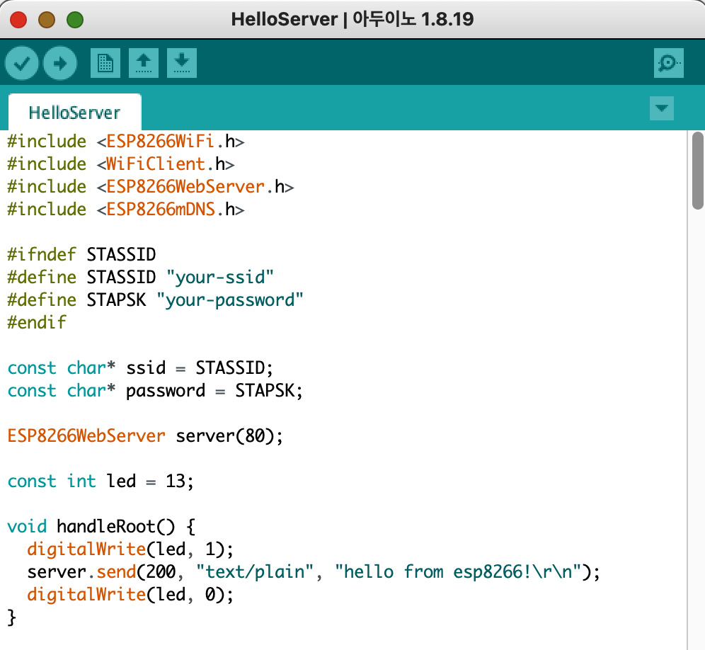 해당 보드 선택 후, 파일 > 예제 > ESP8266WebServer로 진입하면 HelloServer라는 예제를 불러올 수 있게 됩니다.
