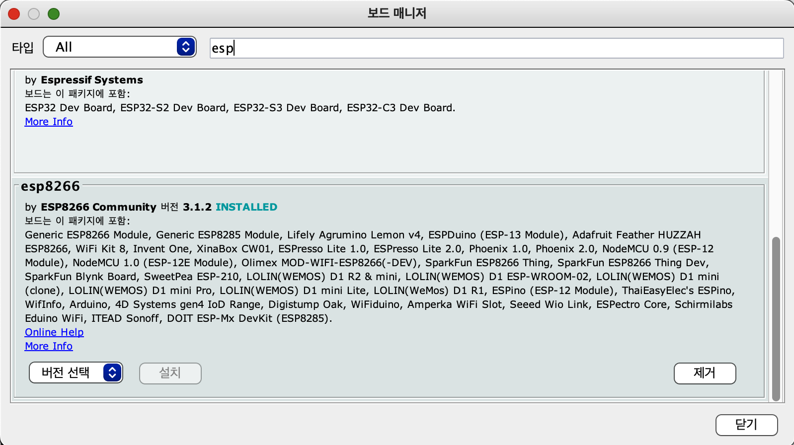 이후 툴 > 보드 > 보드매니저로 이동하여 esp를 검색, esp8266을 설치해줍니다.